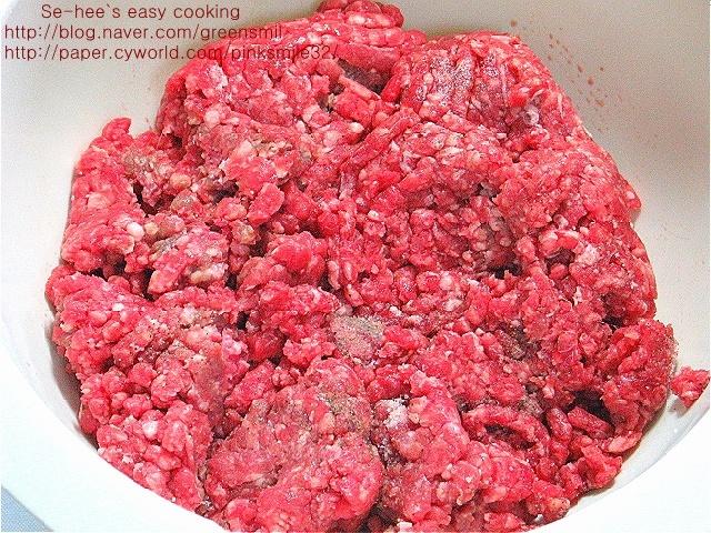 간 돼지고기 한줌(300g)은 소금,후춧가루(0.3)넣어 밑간해요.